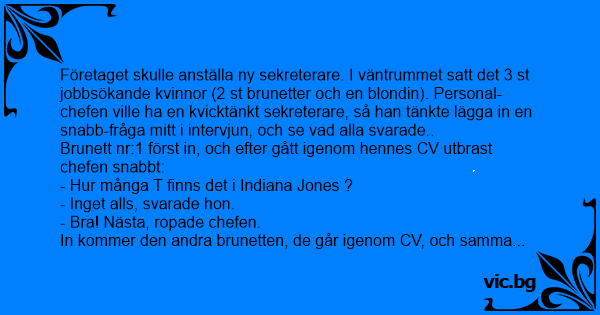 Företaget skulle anställa ny sekreterare. I väntrummet satt det 3 st jobbsökande kvinnor (2 st brunetter och en blondin). Personal-chefen ville ha en kvicktänkt sekreterare, så han tänkte lägga in en snabb-fråga mitt i intervjun, och se vad alla svarade..