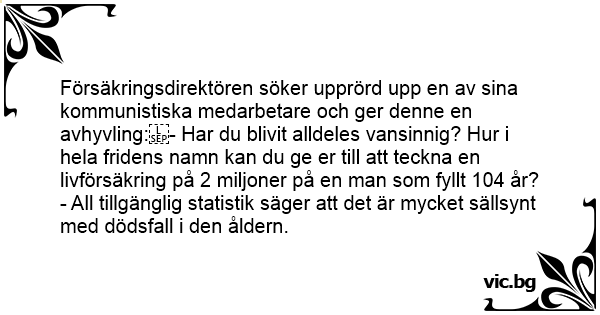 Försäkringsdirektören söker upprörd upp en av sina kommunistiska medarbetare och ger denne en avhyvling: - Har du blivit alldeles vansinnig? Hur i hela fridens namn kan du ge er till att teckna en livförsäkring på 2 miljoner på en man som fyllt 104 år?