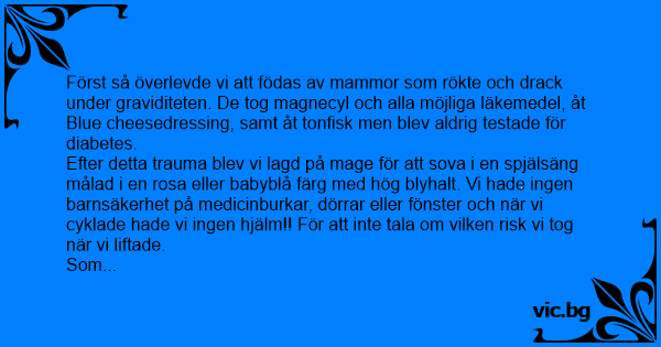 Först så överlevde vi att födas av mammor som rökte och drack under graviditeten. De tog magnecyl och alla möjliga läkemedel, åt Blue cheesedressing, samt åt tonfisk men blev aldrig testade för diabetes.