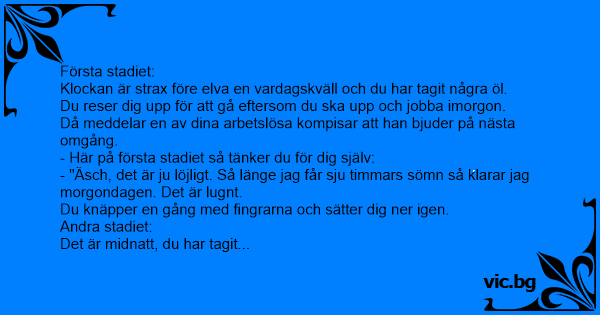 - "Ööhm... Jag måste nog dra mig hemåt. Jag har ett möte vid -fаn- klockan nio. Det är den där frukosten med Нiтlеr. Jag får bara inte missa den. - "Du och dina kompisar dricker någon tjock, blå spritsort. En servitris med färska stygn i armen kommer till ert bord, och du tänker:
