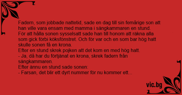 - Ja, då har du förtjänat en krona, skrek fadern från sängkammaren.