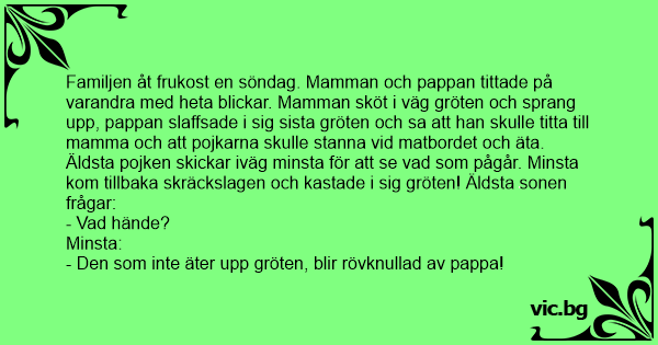 Familjen åt frukost en söndag. Mamman och pappan tittade på varandra med heta blickar. Mamman sköt i väg gröten och sprang upp, pappan slaffsade i sig sista gröten och sa att han skulle titta till mamma och att pojkarna skulle stanna vid matbordet och äta. Äldsta pojken skickar iväg minsta för att se vad som pågår. Minsta kom tillbaka skräckslagen och kastade i sig gröten! Äldsta sonen frågar: