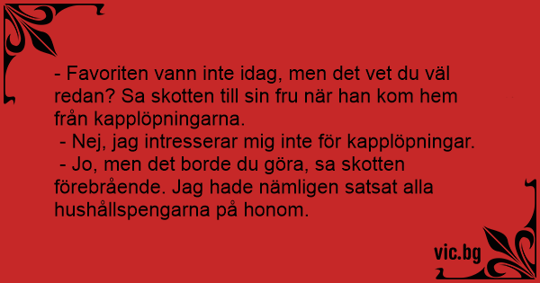 - Favoriten vann inte idag, men det vet du väl redan? Sa skotten till sin fru när han kom hem från kapplöpningarna.