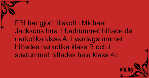 FBI har gjort tillskott i Michael Jacksons hus. I badrummet hittade de narkotika klass A, i vardagsrummet hittades narkotika klass B och i sovrummet hittades hela klass 4c...