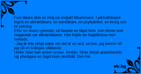 Fem läkare åkte en helg på andjakt tillsammans. I jaktsällskapet ingick en allmänläkare, en barnläkare, en psykiatriker, en kirurg och en patolog.