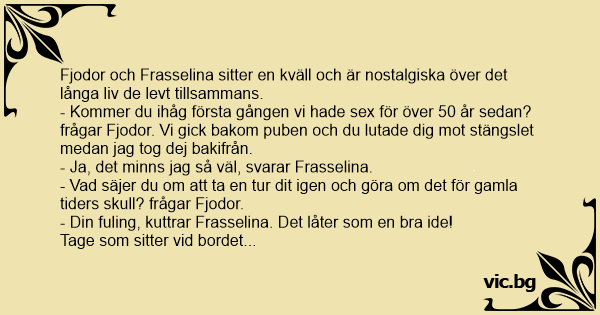 - Kommer du ihåg första gången vi hade sеx för över 50 år sedan? frågar Fjodor. Vi gick bakom puben och du lutade dig mot stängslet medan jag tog dej bakifrån.