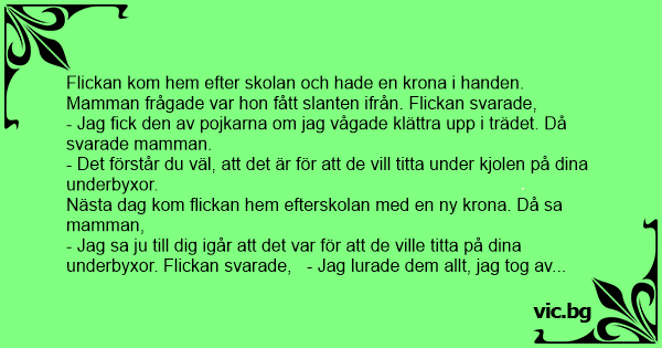 - Jag sa ju till dig igår att det var för att de ville titta på dina underbyxor. Flickan svarade, - Jag lurade dem allt, jag tog av underbyxorna innan...