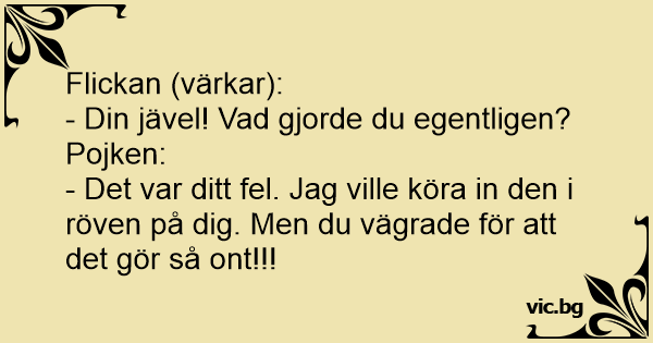 En kvinna ligger i förlossningsrummet med värkar och skriker: - Jag orkar inte mer! Ge mig bedövning! Sen vänder hon sig till sin kille och säger: - Det här är ditt fel, din jävel! Killen svarar lugnt: - Om du minns så ville jag köra in den i andra...