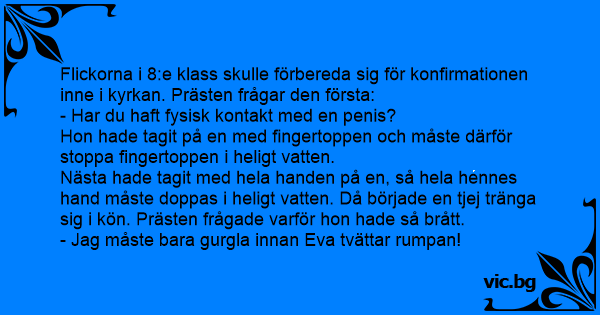 Jentene som skulle konfirmeres skulle forberede seg til konfirmasjonen i kirken. Presten spør den første: "Har du hatt fysisk kontakt med en penis?" Hun måtte inrømme at hun hadde vært borte i en...