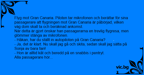 A pilóta felszáll, átkapcsol robot pilótára, nyújtózik egy nagyot, de a Mikrofont bekapcsolva felejti és így szól: - Most iszom egy kávét, utána jól megdugom a kis szőke stewardesst. Hátul a...