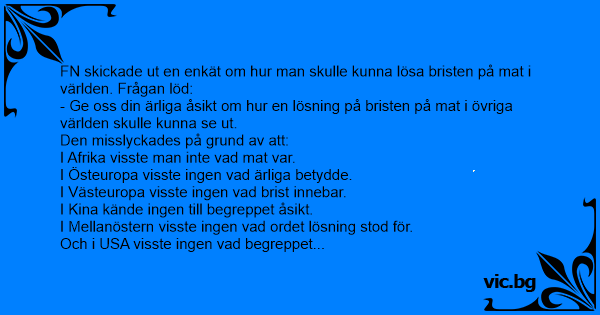 A ONU resolveu fazer uma pesquisa em todo o mundo. Enviou uma carta para o representante de cada país com a pergunta: "Por favor, diga honestamente qual é a sua opinião sobre a escassez de alimentos no resto do mundo". Mas pesquisa foi um grande fracasso. Todos os países europeus não entenderam...