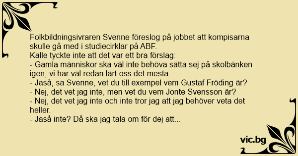 - Gamla människor ska väl inte behöva säтта sej på skolbänken igen, vi har väl redan lärt oss det mesta.