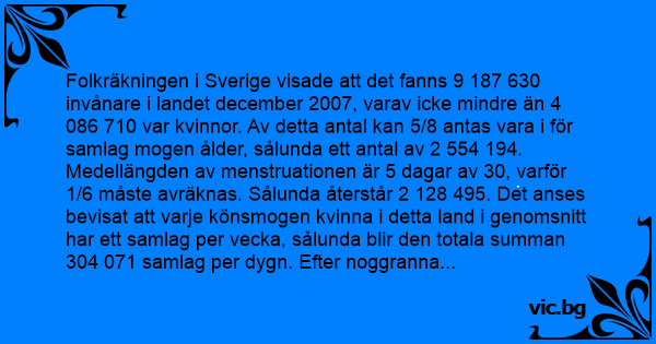 Folkräkningen i Sverige visade att det fanns 9 187 630 invånare i landet december 2007, varav icke mindre än 4 086 710 var kvinnor. Av detta antal kan 5/8 antas vara i för samlag mogen ålder, sålunda ett antal av 2 554 194. Medellängden av menstruationen är 5 dagar av 30, varför 1/6 måste avräknas. Sålunda återstår 2 128 495. Det anses bevisat att varje könsmogen kvinna i detta land i genomsnitt har ett samlag per vecka, sålunda blir den totala summan 304 071 samlag per dygn. Efter noggranna beräkningar har statistiken fastställt medellängden av en svensk erigerad реnis till 16,4 cm. Man har kommit fram till att 75 instick i kvinnans vulvа är normalt för att utlösa den manliga säden. Då varje instick motsvaras av ett lika stort utdrag får man för varje samlag 75*2*16,4 cm dvs 21,6 m. Multipliceras detta med 304 701 fås att per dygn instickes inte mindre än 6 567 933,6 meter реnis i Sverige, vilket ger 273 633,9 m/tim. Vi finner sålunda att varje timme är 27 mil präktig svensk ståkuk på glid i de svenska folkhemmen. Om varje samlag i snitt utlöser en sädesvätska om 5 ml upp- går vätskemängden per dygn till 5*304 071 ml dvs 1 520 355 ml eller ungefär 1 520 liter. Per år blir motsvarande mängd 1 520*365 = 554800 liter. Ett vanligt badkar rymmer ca. 200 liter.
