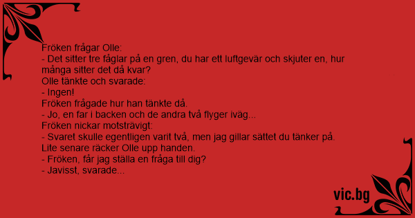 I skolan frågar fröken: - Det sitter fem kråkor på en gren. Du skjuter en, hur många sitter kvar? Pelle svarar: - Inga. - Ja, sa fröken jag hade tänkt fyra men jag förstår vad du menar. Pelle...