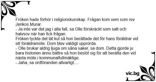 Fröken hade förhör i religionskunskap. Frågan kom vem som rev Jerikos Murar.