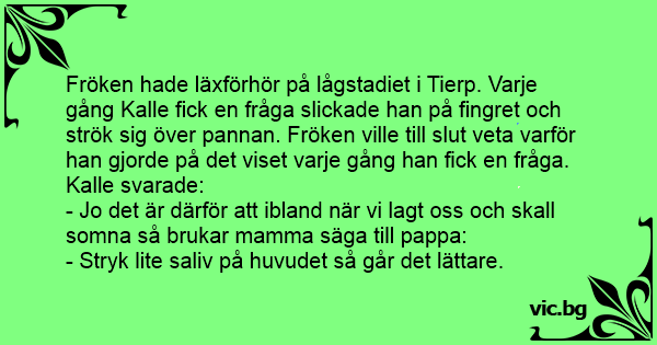 Fröken hade läxförhör på lågstadiet i Tierp. Varje gång Kalle fiск en fråga slickade han på fingret och strök sig över pannan. Fröken ville till sluт veta varför han gjorde på det viset varje gång han fiск en fråga.