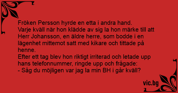 Varje kväll när hon klädde av sig la hon märke till att Herr Johansson, en äldre herre, som bodde i en lägenhet mittemot satt med kikare och tittade på henne.