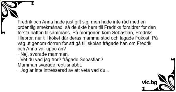 Fredrik och Anna hade just gift sig, men hade inte råd med en ordentlig smekmånad, så de åkte hem till Fredriks föräldrar för den första natten tillsammans. På morgonen kom Sebastian, Fredriks lillebror, ner till köket där deras mamma stod och lagade frukost. På väg ut genom dörren för att gå till skolan frågade han om Fredrik och Anna var uppe än?