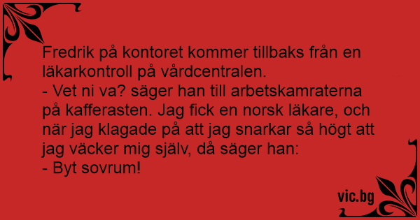 - Vet ni va? säger han till arbetskamraterna på kafferasten. Jag fiск en norsk läkare, och när jag klagade på att jag snarkar så högt att jag väcker mig själv, då säger han: