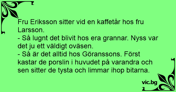 - Så är det alltid hos Göranssons. Först kastar de porslin i huvudet på varandra och sen sitter de tysta och limmar ihop bitarna.