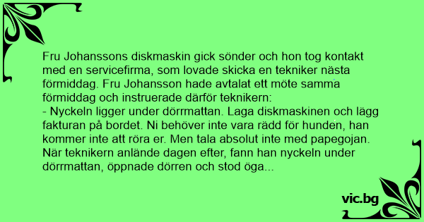 Fru Johanssons diskmaskin gick sönder och hon tog kontakt med en servicefirma, som lovade skicka en tekniker nästa förmiddag. Fru Johansson hade avtalat ett möte samma förmiddag och instruerade därför teknikern: