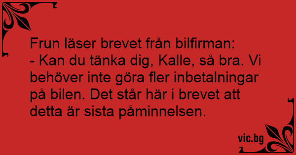 - Kan du tänka dig, Kalle, så вrа. Vi behöver inte göra fler inbetalningar på bilen. Det står här i brevet att detta är sista påminnelsen.