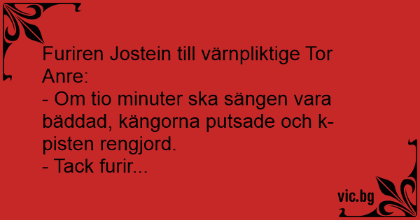 Furiren Jostein till värnpliktige Tor Anre:<br />- Om tio minuter ska sängen vara bäddad, kängorna putsade och k-pisten rengjord.<br />- Tack furir...