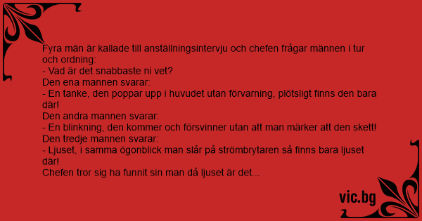 Fyra män är kallade till anställningsintervju och chefen frågar männen i tur och ordning:
