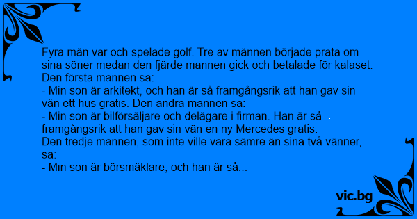 Fyra män var och spelade golf. Tre av männen började prata om sina söner medan den fjärde mannen gick och betalade för kalaset. Den första mannen sa: