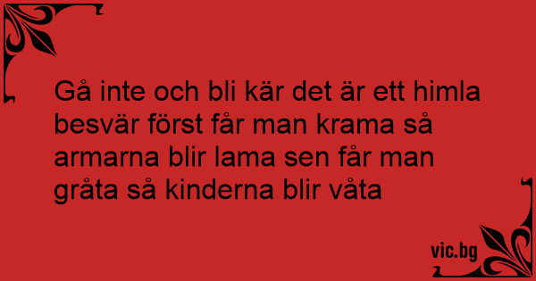 Gå inte och bli kär det är ett himla besvär först får man krama så armarna blir lama sen får man gråta så kinderna blir våta