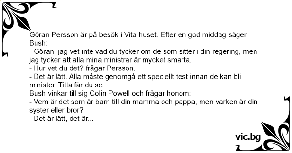 - Вrа, säger Bush och Persson är mäkta imponerad. Väl hemma funderar Göran Persson över intelligensen i den egna regeringen. Han ber Bosse Ringholm komma in och frågar med luring ton på rösten: