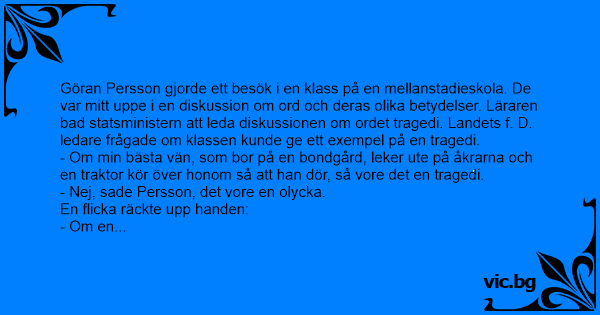 Göran Persson gjorde ett besök i en klass på en mellanstadieskola. De var mitt uppe i en diskussion om ord och deras olika betydelser. Läraren bad statsministern att leda diskussionen om ordet tragedi. Landets f. D. ledare frågade om klassen kunde ge ett exempel på en tragedi.