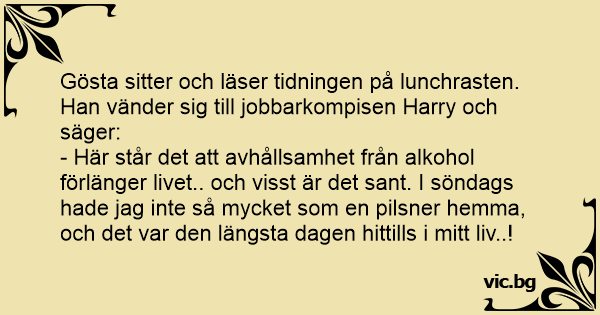 - Här står det att avhållsamhet från alkohol förlänger livet.. och visst är det sant. I söndags hade jag inte så mycket som en pilsner hemma, och det var den längsta dagen hittills i mitt liv..!