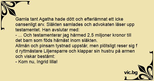 - ... Och testamenterar jag härmed 2,5 miljoner kronor till det barn som föds härnäst inom släkten.