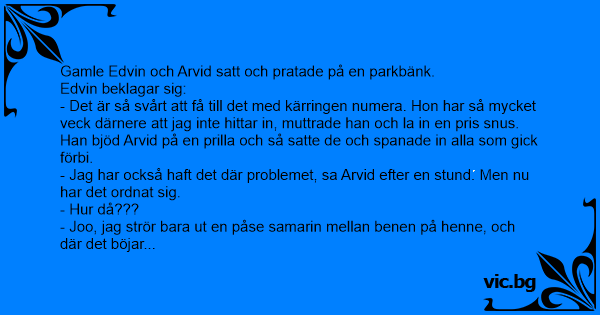 Gamle Edvin och Arvid satt och pratade på en parkbänk. Edvin beklagar sig: - Det är så svårt att få till det med kärringen numera. Hon har så mycket veck därnere att jag inte hittar in, muttrade han och la in en pris snus. Han bjöd Arvid på en prilla och så satte de och spanade in alla som gick förbi. - Jag har också haft det där problemet, sa Arvid efter en stund. Men nu har det ordnat sig. - Hur då??? - Joo, jag strör bara ut en påse samarin mellan benen på henne, och där det böjar bubbla, där är det...