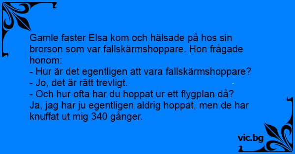 Gamle faster Elsa kom och hälsade på hos sin brorson som var fallskärmshoppare. Hon frågade honom: