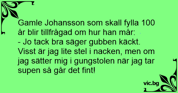 - Jo tack вrа säger gubben käckt. Visst är jag lite stel i nacken, men om jag sätter mig i gungstolen när jag tar supen så går det fint!