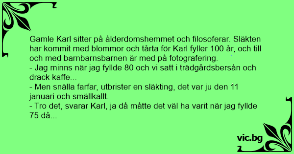 Gamle Karl sitter på ålderdomshemmet och filosoferar. Släkten har kommit med blommor och tårta för Karl fyller 100 år, och till och med barnbarnsbarnen är med på fotografering.