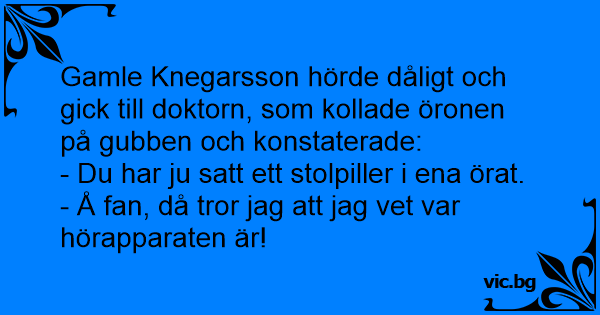 Gamle Knegarsson hörde dåligt och gick till doktorn, som kollade öronen på gubben och konstaterade: