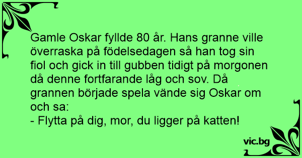 Gamle Oskar fyllde 80 år. Hans granne ville överraska på födelsedagen så han tog sin fiol och gick in till gubben tidigt på morgonen då denne fortfarande låg och sov. Då grannen började spela vände sig Oskar om och sa: