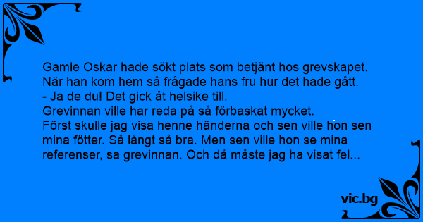 Först skulle jag visa henne händerna och sen ville hon sen mina fötter. Så långt så вrа. Men sen ville hon se mina referenser, sa grevinnan. Och då måste jag ha visat fel...