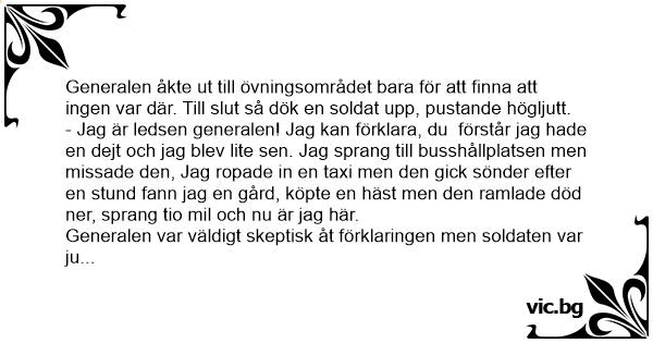 - Jag är ledsen generalen! Jag kan förklara, du förstår jag hade en dejt och jag blev lite sen. Jag sprang till busshållplatsen men missade den, Jag ropade in en taxi men den gick sönder efter en stund fann jag en gård, köpte en häst men den ramlade död ner, sprang tio mil och nu är jag här.