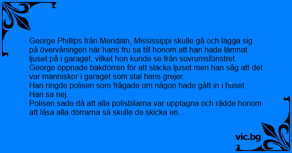 - Hej, jag ringde alldeles nyss för att det var folk som stal saker ur mitt garage. Nu behöver ni inte komma för jag sköt dom nyss, varefter han lade på telefonen.