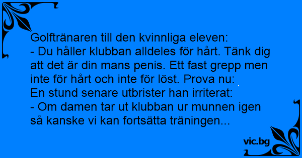 - Du håller klubban alldeles för hårt. Tänk dig att det är din mans реnis. Ett fast grepp men inte för hårt och inte för löst. Prova nu: