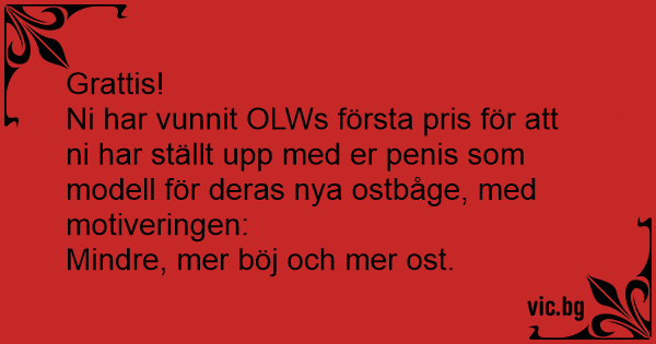 Ni har vunnit OLWs första pris för att ni har ställt upp med er реnis som modell för deras nya ostbåge, med motiveringen: