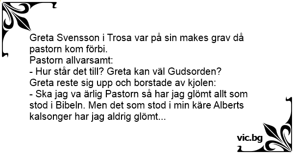 - Ska jag va ärlig Pastorn så har jag glömt allt som stod i Bibeln. Men det som stod i min käre Alberts kalsonger har jag aldrig glömt...