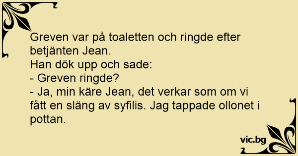 - Ja, min käre Jean, det verkar som om vi fått en släng av syfilis. Jag tappade ollonet i pottan.