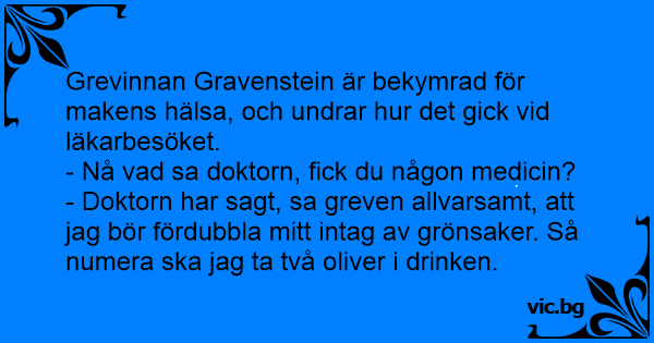 - Doktorn har sagt, sa greven allvarsamt, att jag bör fördubbla mitt intag av grönsaker. Så numera ska jag ta två oliver i drinken.