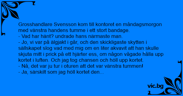 Grosshandlare Svensson kom till kontoret en måndagsmorgon med vänstra handens tumme i ett stort bandage.