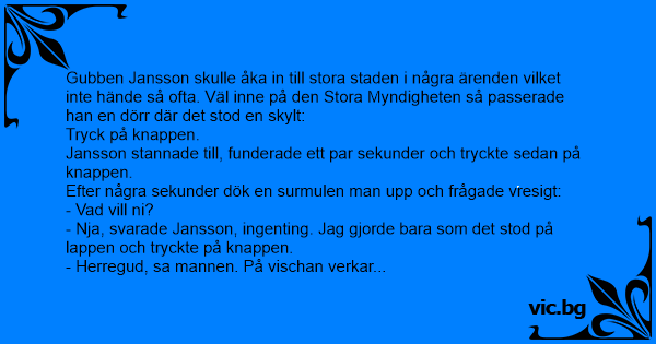Gubben Jansson skulle åka in till stora staden i några ärenden vilket inte hände så ofta. Väl inne på den Stora Myndigheten så passerade han en dörr där det stod en skylt: